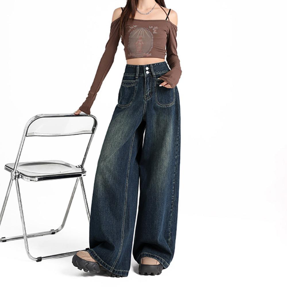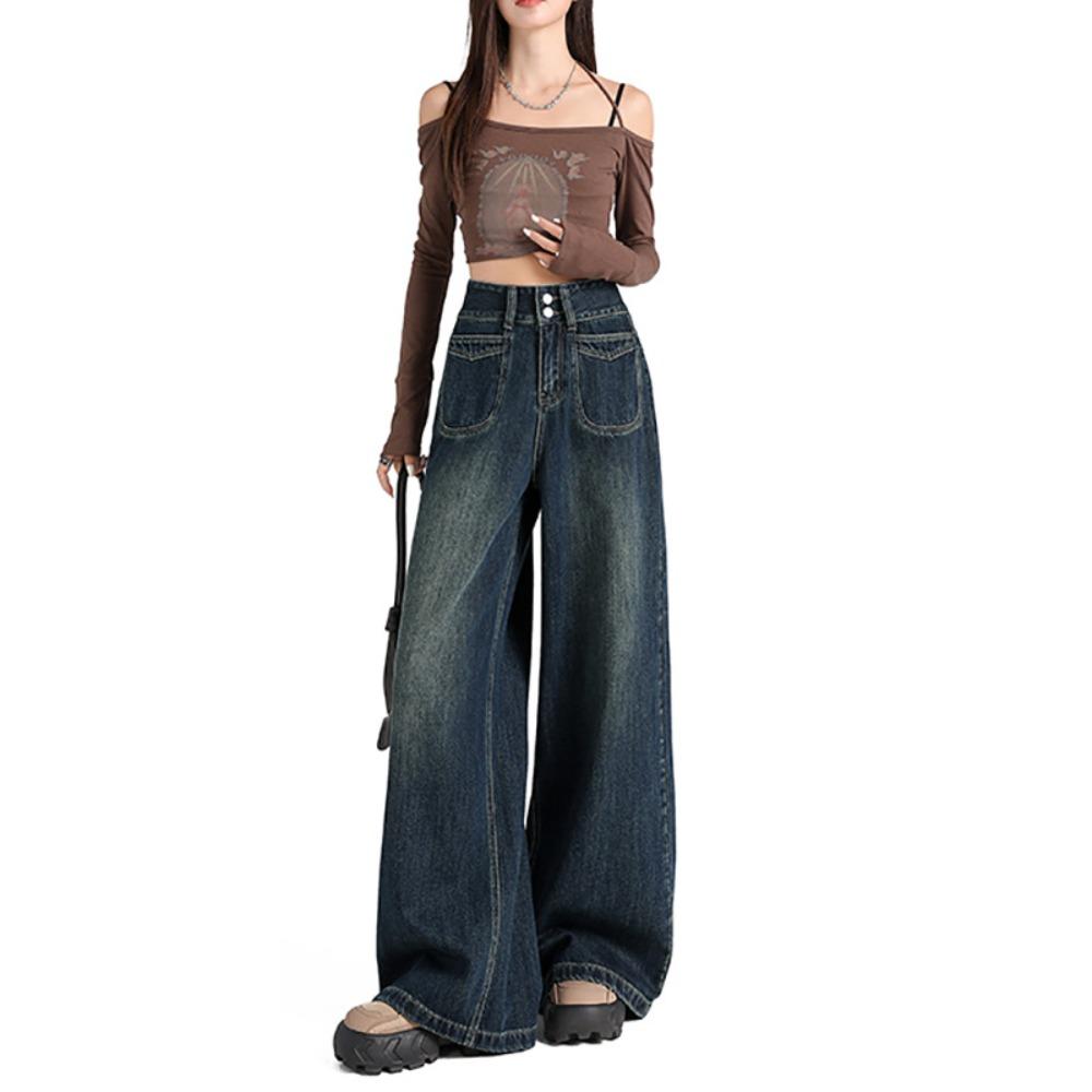 Уличный стиль, трендовые драпированные джинсы с высокой талией и двойной пряжкой, женские простые и универсальные джинсы-швабры с широкими штанинами, тренд