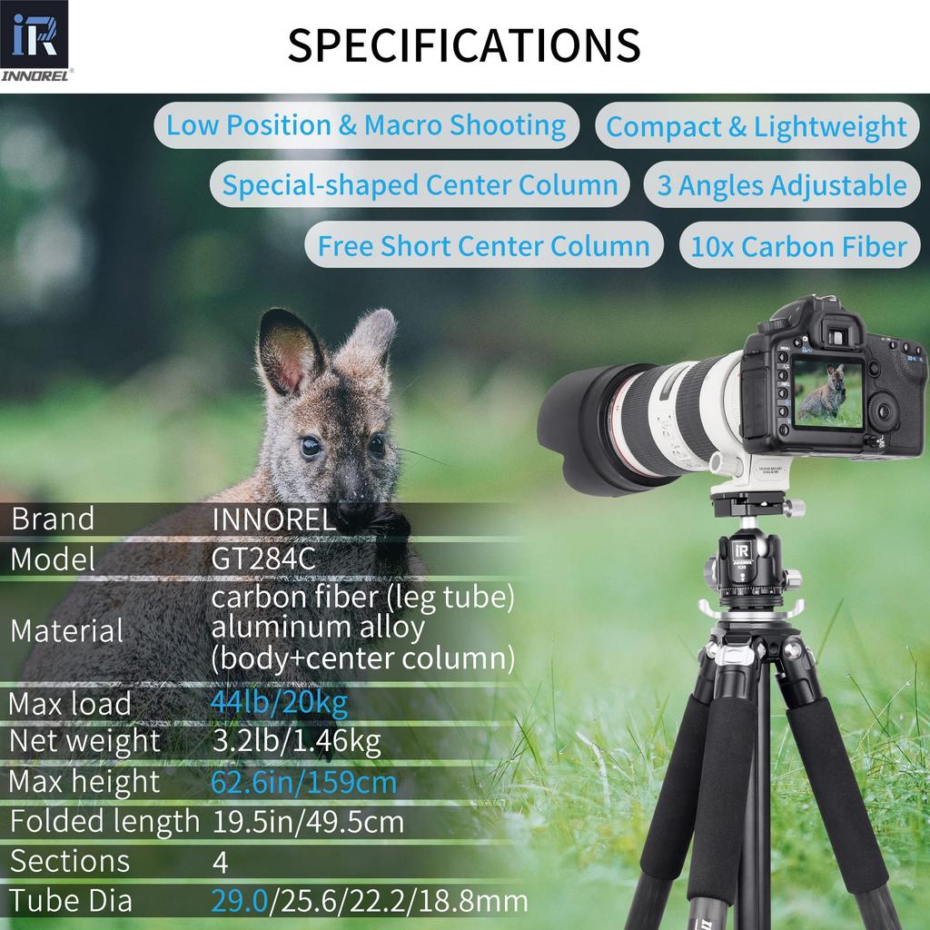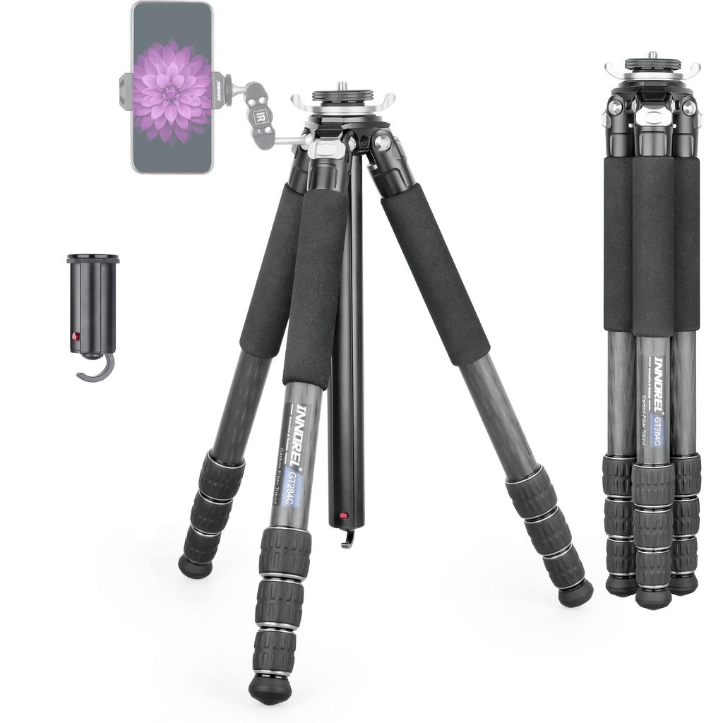 [Легкий дизайн и портативный объем] Все три ножки этого карбонового штатива изготовлены из 10-слойного углеволокна, которое более прочное и легкое, чем обычные изделия из алюминиевого сплава. И благодаря новейшей конструкции с нерегулярной центральной штангой, весь штатив очень компактен. Размер в сложенном виде составляет всего 22,64 дюйма/49,5 см.. Также в комплекте идет сумка для хранения штатива и головки.