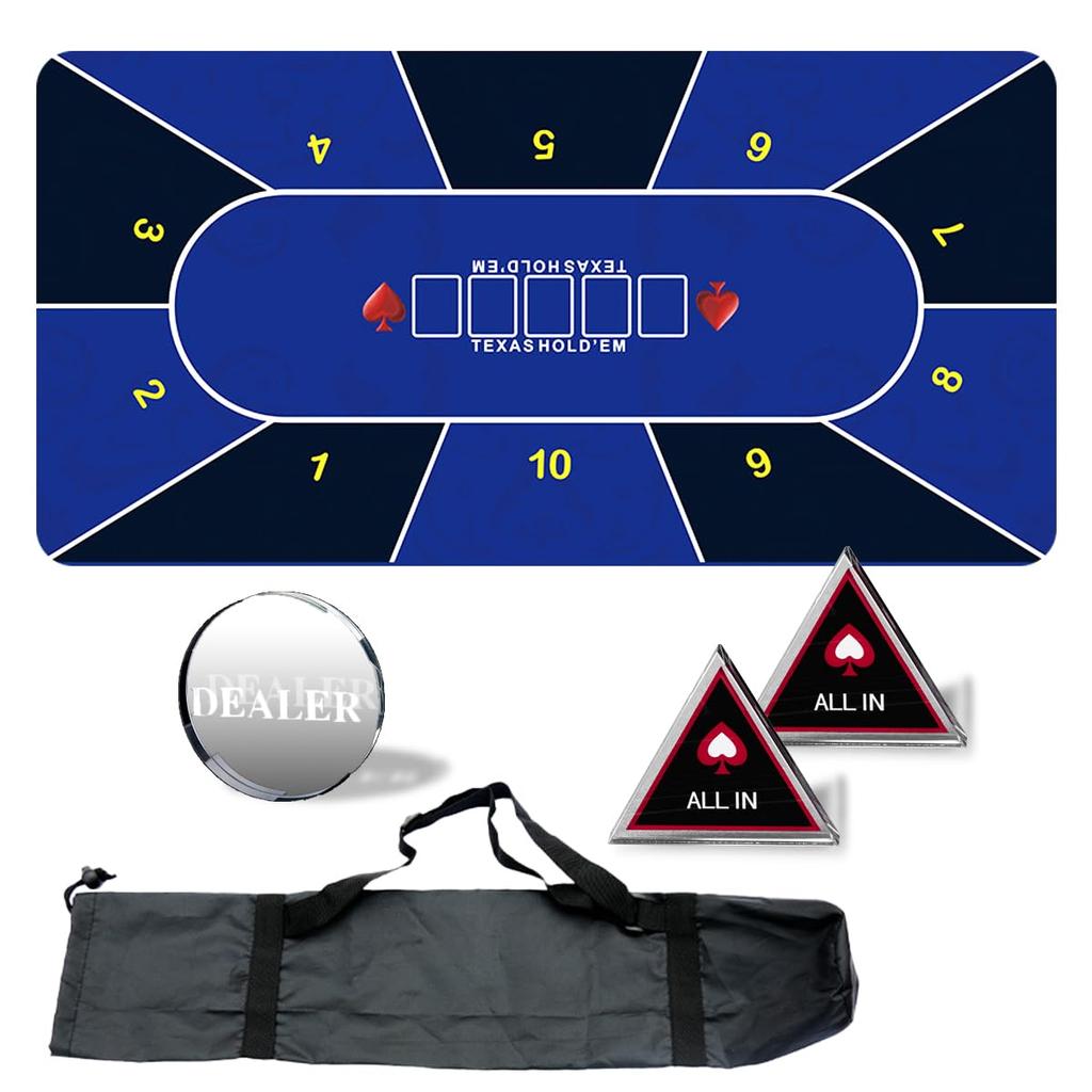Покерный мат, ширина 120 см x толщина 0,2 мм x длина 60 см, поверхность: полиэстеровый коврик, спинка: резина, 1 шт., кнопка дилера (круговой) диаметр 5,6 см x ширина 1 см, вес 60 г, 1 шт., акрил, маркер all-in (треугольник) длина 7,2 см ширина 1 см, вес 57 г 2 шт, акрил, мешочек для хранения (для хранения коврика в свернутом виде) 1 штука *Цвета могут немного отличаться в зависимости от настроек вашего монитора.