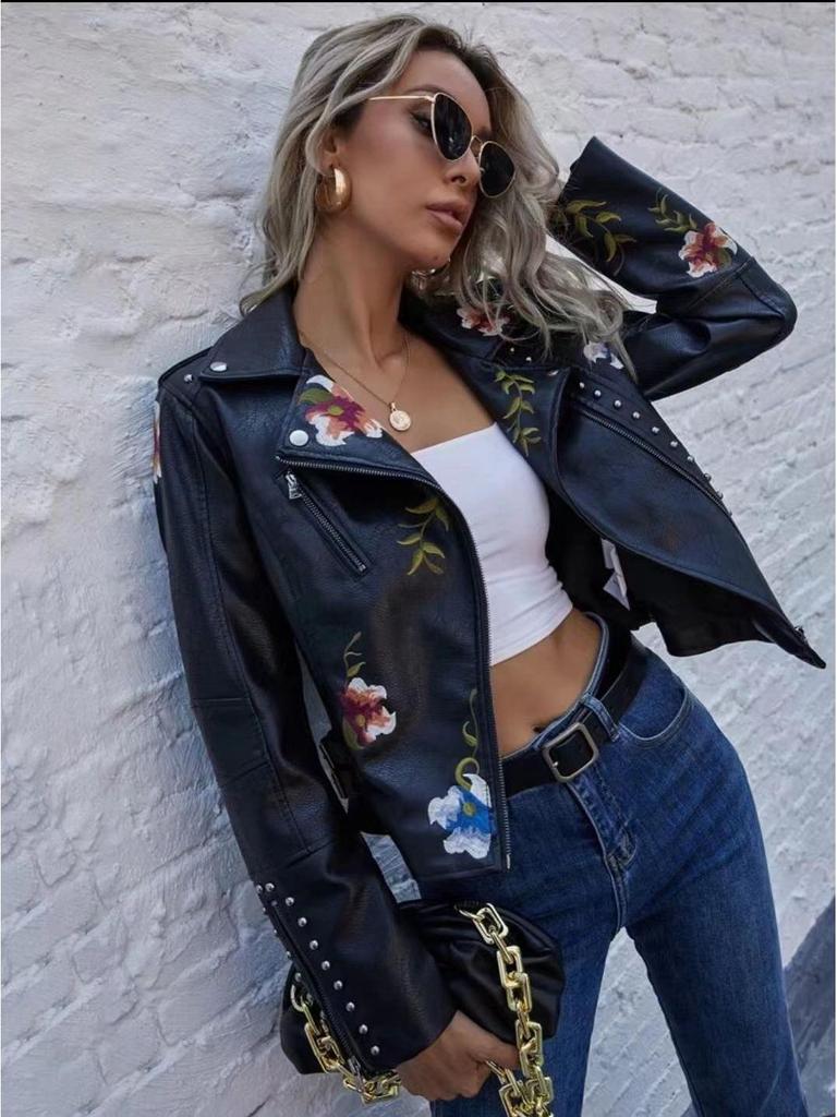 Поднимите свой гардероб этой шикарной женской кожаной курткой, идеально подходящей для добавления нотки изысканности любому наряду.. Эта куртка, изготовленная из высококачественной кожи, имеет стильный воротник-стойку и длинные рукава, что делает ее универсальной вещью для переходной погоды.. Выдающиеся детали включают сложную вышивку и смелые заклепки, которые сочетают европейские и американские модные тенденции для создания поистине уникального образа.. Разработанная с акцентом как на форму, так и на функцию, эта куртка является обязательной вещью в коллекции любого модного человека.