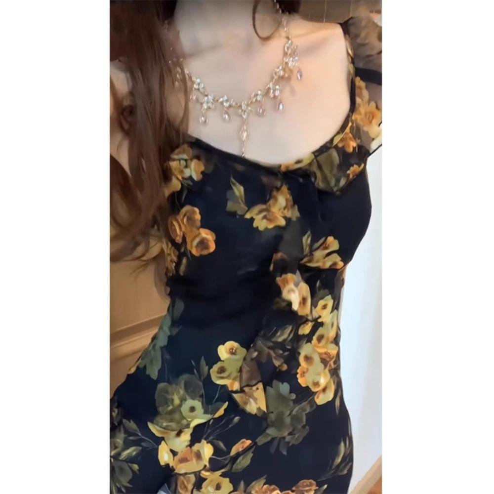 Ретро цветочное платье на бретелях женское летнее темпераментное с оборками, листовым краем, приталенное, с разрезом, облегающее бедра, длинная юбка