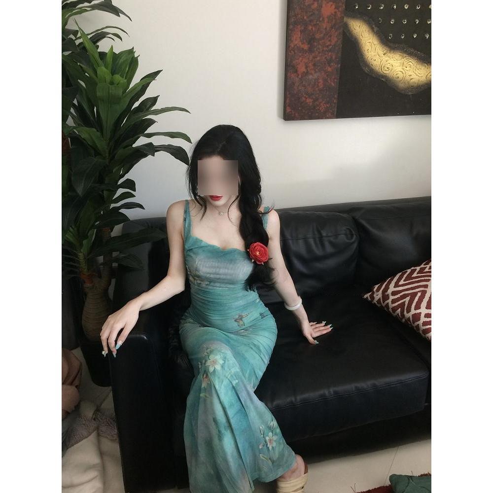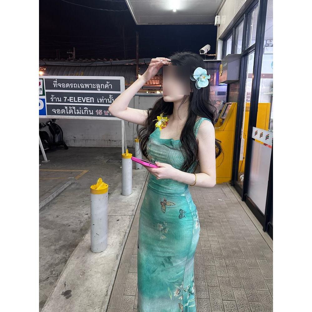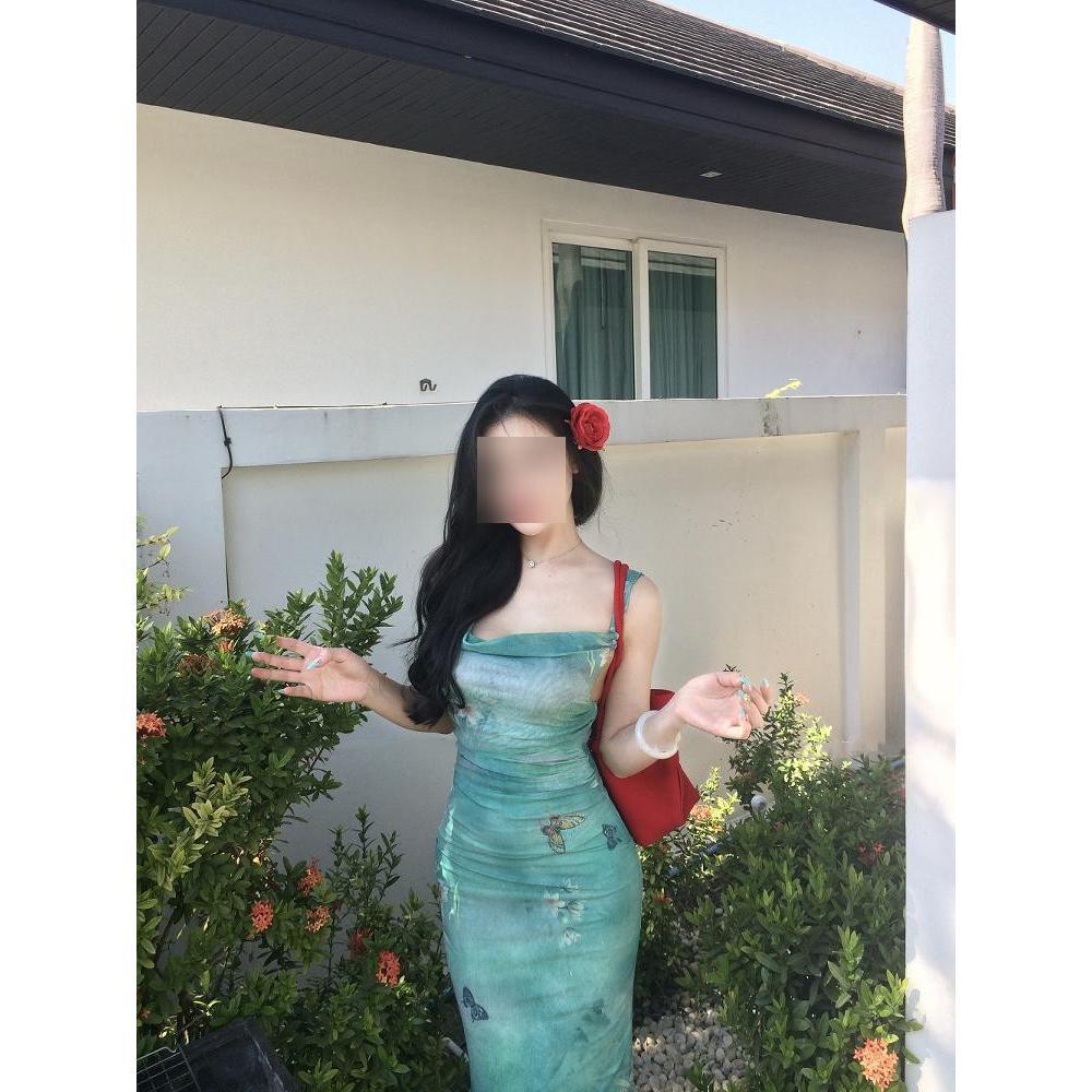 Французское зеленое платье с принтом, отложным воротником, на бретелях, для морского отдыха, красивое, приталенное, с юбкой «рыбий хвост», облегающее бедра, женское летнее
