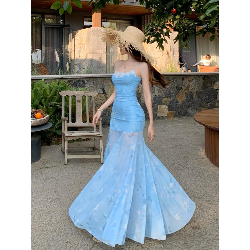 Пляжный отдых облегающее длинное платье Французская Spice Girl Дофаминовый наряд Синее кружево вставками Принтованная сетка Юбка на бретелях
