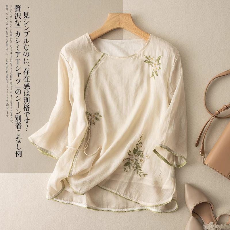 Хлопковая и льняная литературная и ретро футболка с рукавом три четверти, изысканная вышитая футболка, летняя новая универсальная женская