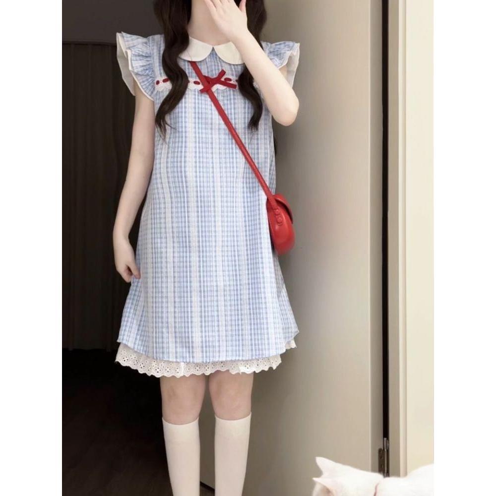 Японское нежное и милое маленькое платье в стиле колледжа, с широким маленьким рукавом-крылышком, женское свободное, уменьшающее возраст, с кукольным воротником и вставками