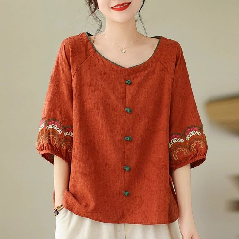 Хлопково-льняной топ с вышивкой с рукавом до локтя, литературный, ретро, свободная футболка с коротким рукавом, весенне-летняя новинка женской одежды