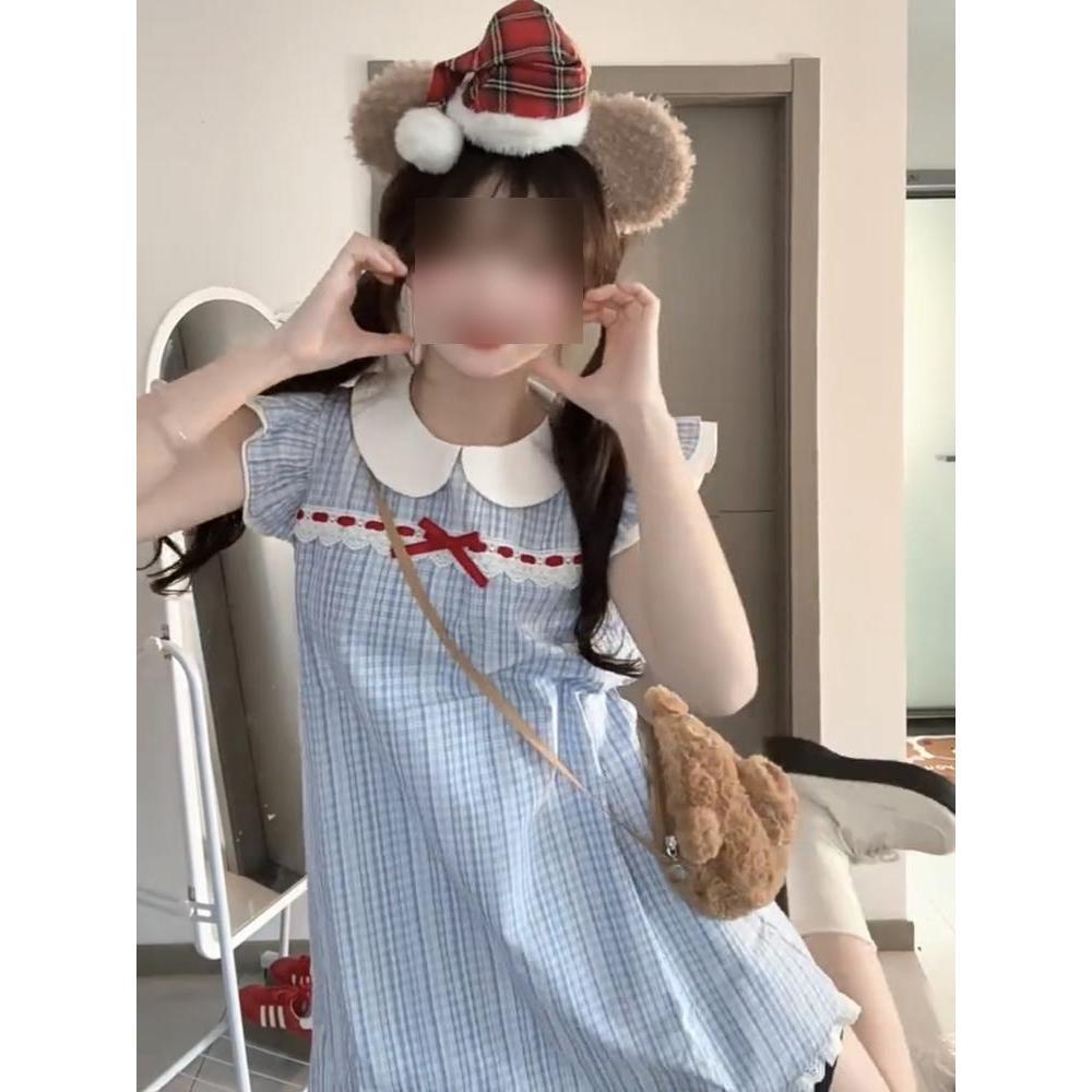 Летняя одежда маленькая рубашка юбка женская студенческая клетчатая вставка свободный кукольный воротник маленький рукав-крылышко платье