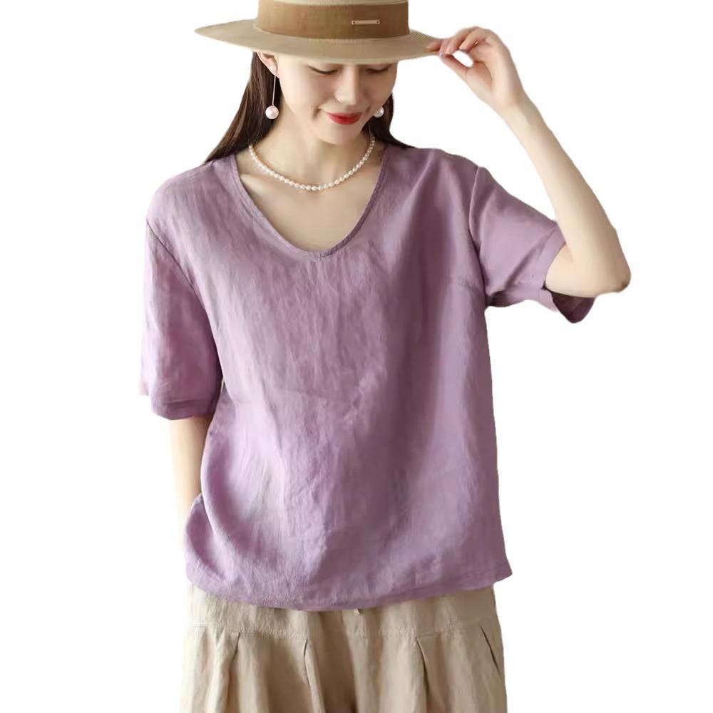Новый ретро хлопково-льняной топ женский свободный и тонкий джемпер с V-образным вырезом и короткими рукавами, повседневная однотонная футболка, льняная рубашка, лето