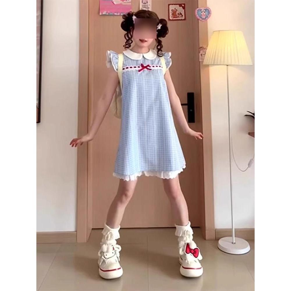 Кукольный воротник, маленький рукав-крылышко, клетчатое платье, женское, летнее, в студенческом стиле, милое платье принцессы первой любви, маленькая свободная юбка