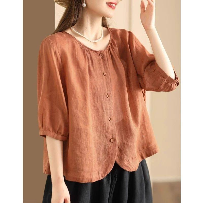 Хлопково-льняная однотонная простая футболка с круглым вырезом, свободная женская одежда, лето, новинка, свободный, универсальный, с темпераментом, кардиган-топ