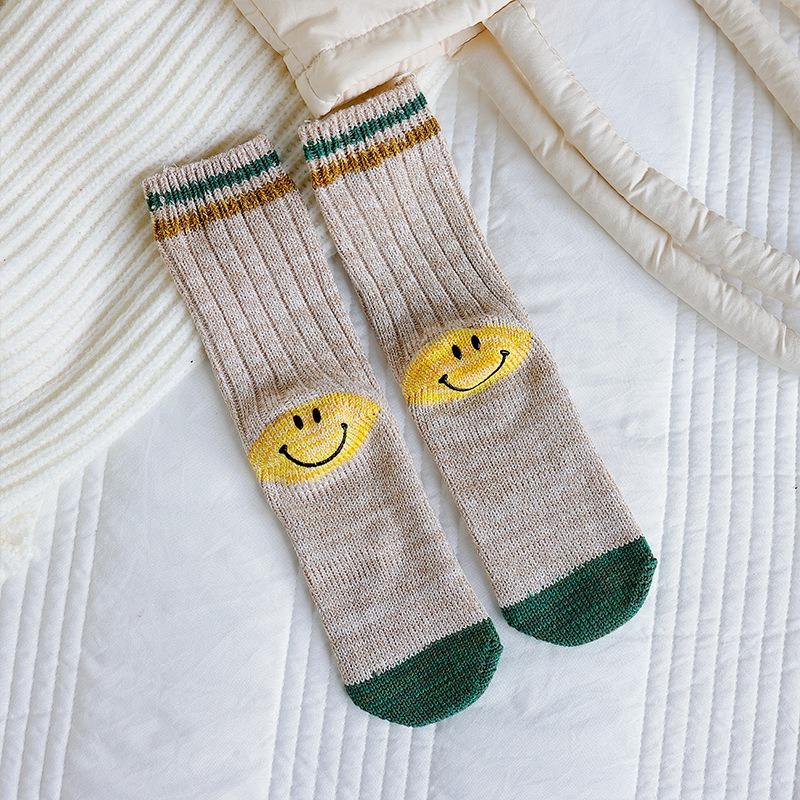 Женские весенне-осенние хлопковые носки до середины голени с улыбающимся лицом на пятке, вязаные из толстой шерстяной пряжи
