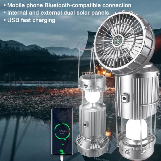 Оцените максимальное удобство с кемпинговым фонарем, многофункциональным устройством, объединяющим кемпинговые фонари, вентиляторы и Bluetooth-совместимые динамики.. Выберите между солнечным или батарейным питанием для универсального использования во время кемпинга, походов или при возникновении чрезвычайных ситуаций.. Упростите свое снаряжение с помощью этого решения «все в одном».