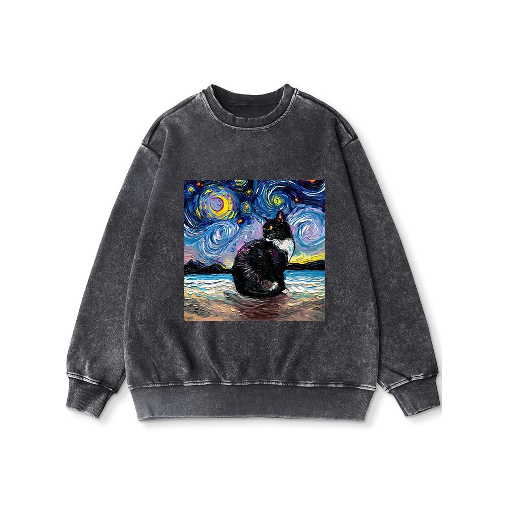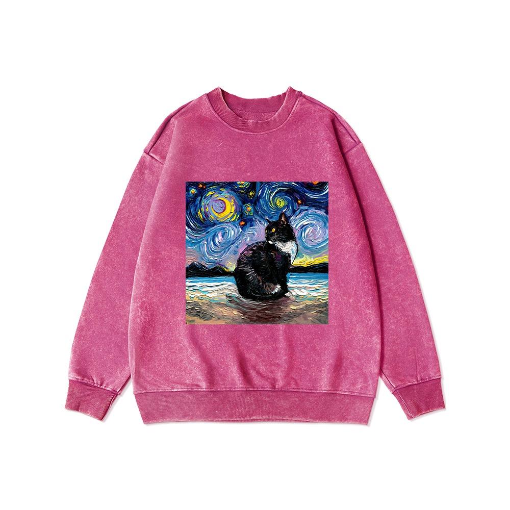 Красивая женская толстовка с принтом "Звездные кошки" в стиле "потертый" с круглым вырезом, оверсайз, из тонкого хлопка.