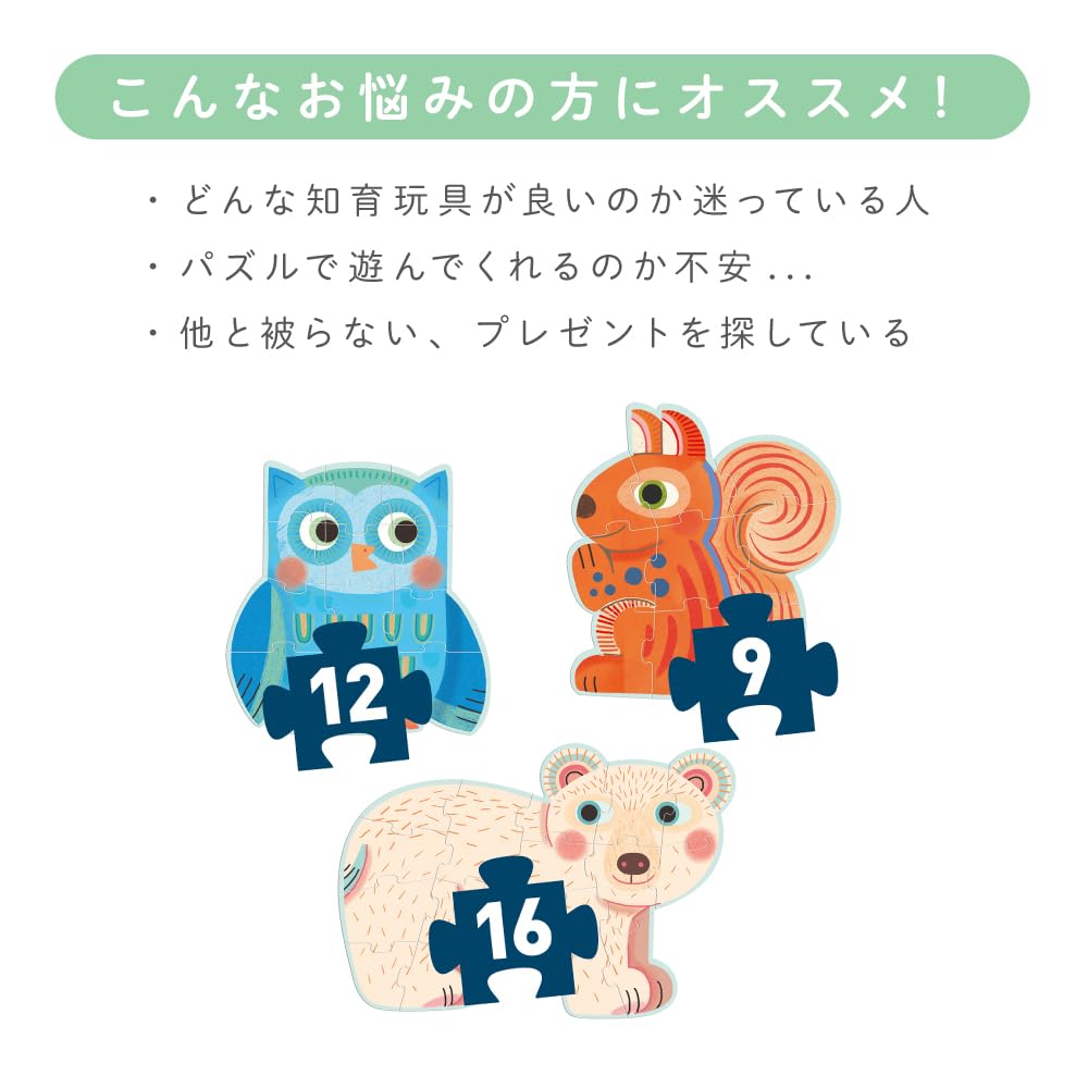 [Для детей 2, 2,5 и 3 лет] [Первый пазл] Этот набор пазлов для малышей включает три вида пазлов с животными: 9 штук, 12 штук и 16 штук. Уровень сложности определяется количеством деталей, поэтому мы рекомендуем это как первый пазл.