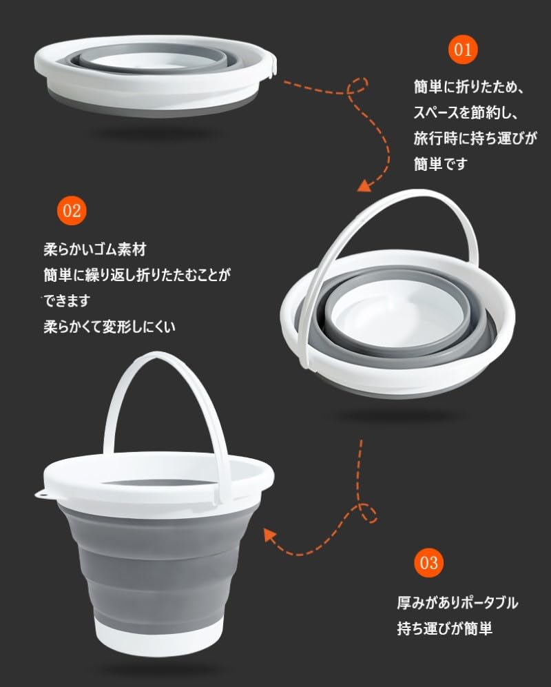 Складной дизайн: Это мягкое ведро складывается тонко и компактно для удобства транспортировки и хранения.