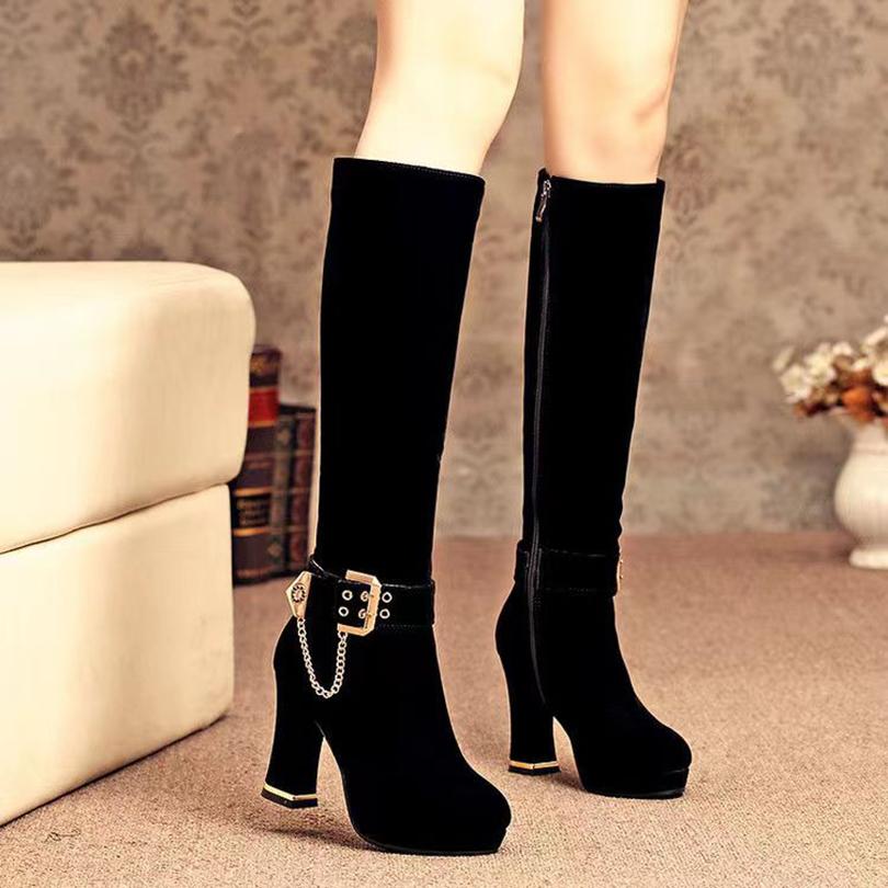 Металлическая пряжка на щиколотке Металлическая цепочка Матовая флокированная женская эластичная обувь Платформа Очень высокий толстый каблук Молния Сапоги до колена