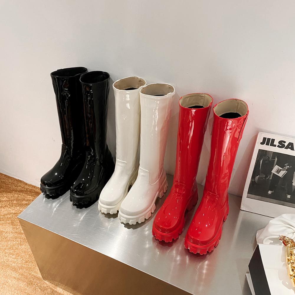 Яркие кожаные сапоги выше колена на водонепроницаемой платформе с внутренним усиленным круглым носком и платформой на плоском каблуке из лакированной кожи
