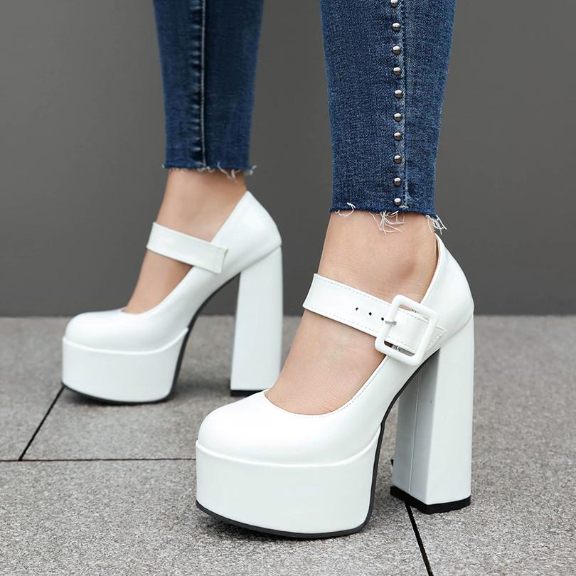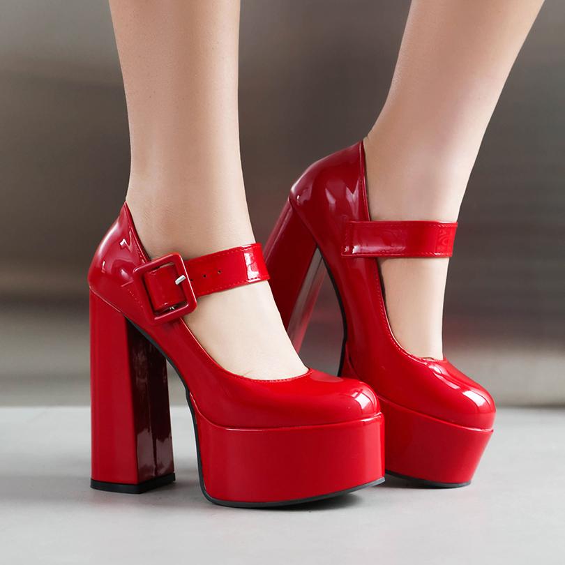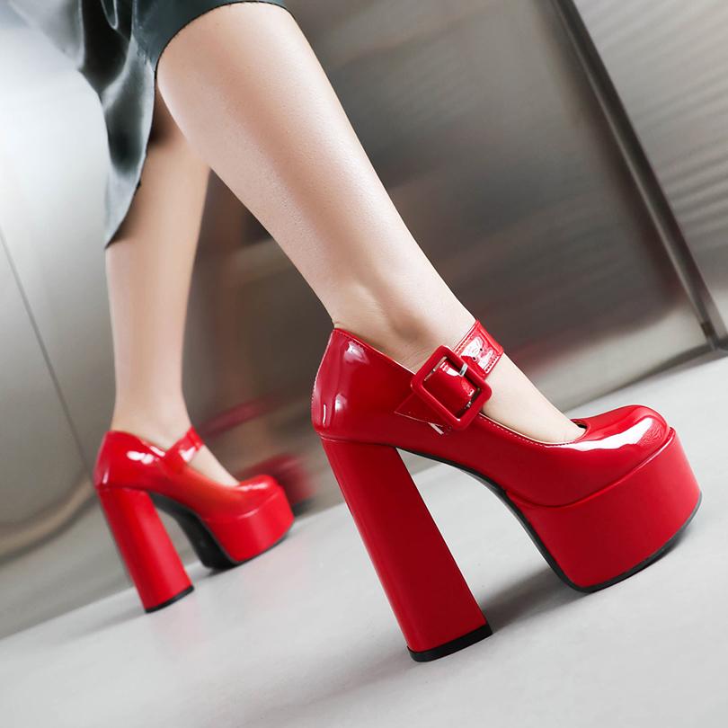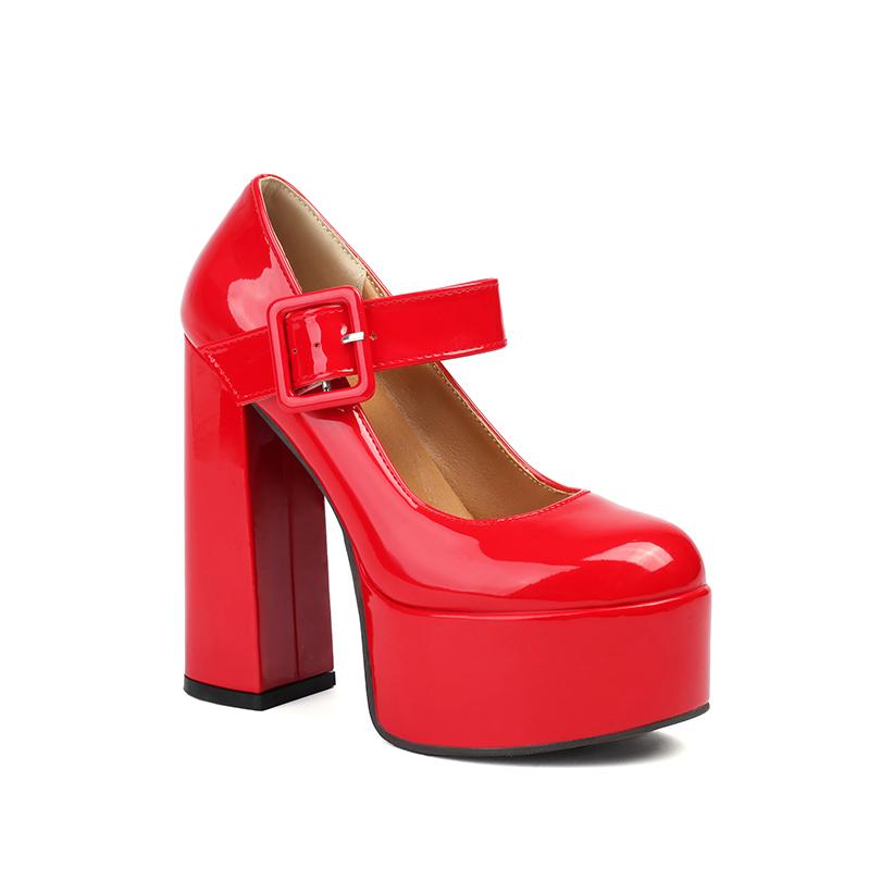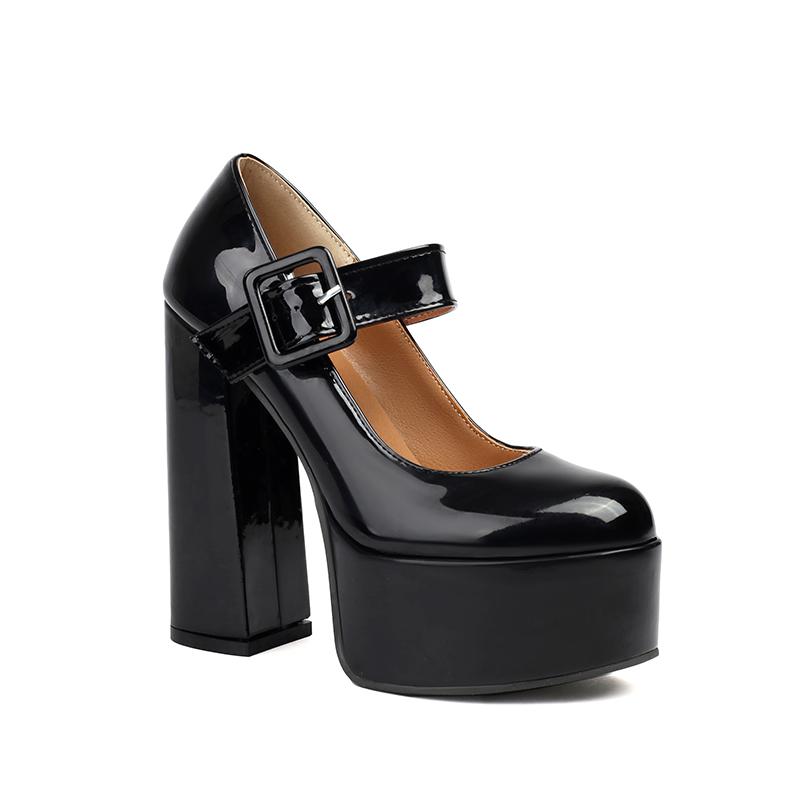 Высокая платформа Ультравысокий толстый каблук Глянцевая лакированная кожа Квадратная пряжка Женские туфли на высоком каблуке Дышащие неглубокие туфли-лодочки