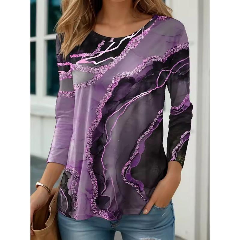 Женская футболка Топы Графический Абстрактный принт Длинный рукав Повседневная Мода на выходные Круглый вырез Стандартный крой Весна и Лето