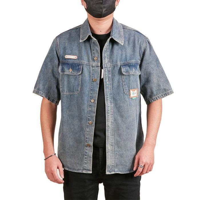 Джинсовая вышитая рубашка с коротким рукавом для мужской весны, новая мужская куртка, повседневная студенческая рубашка