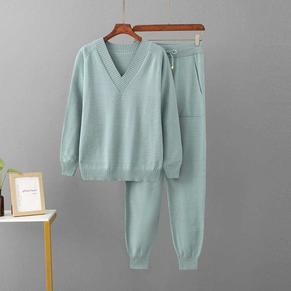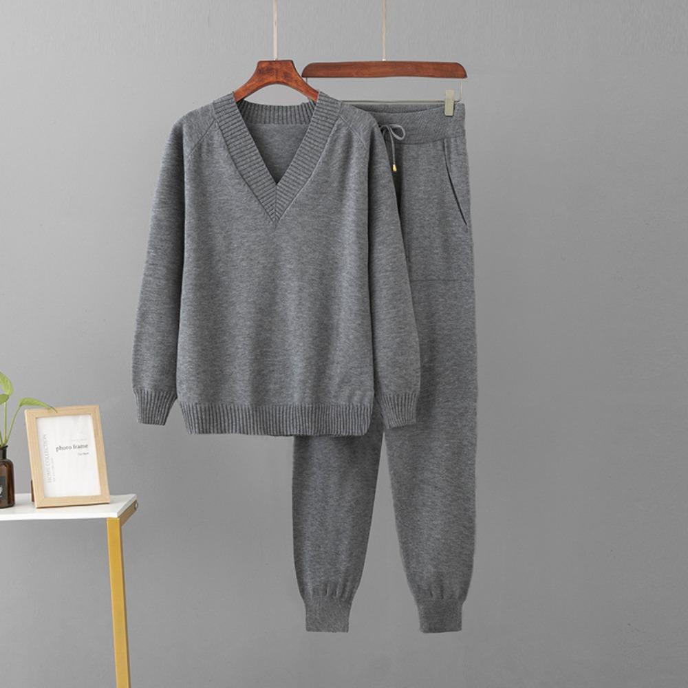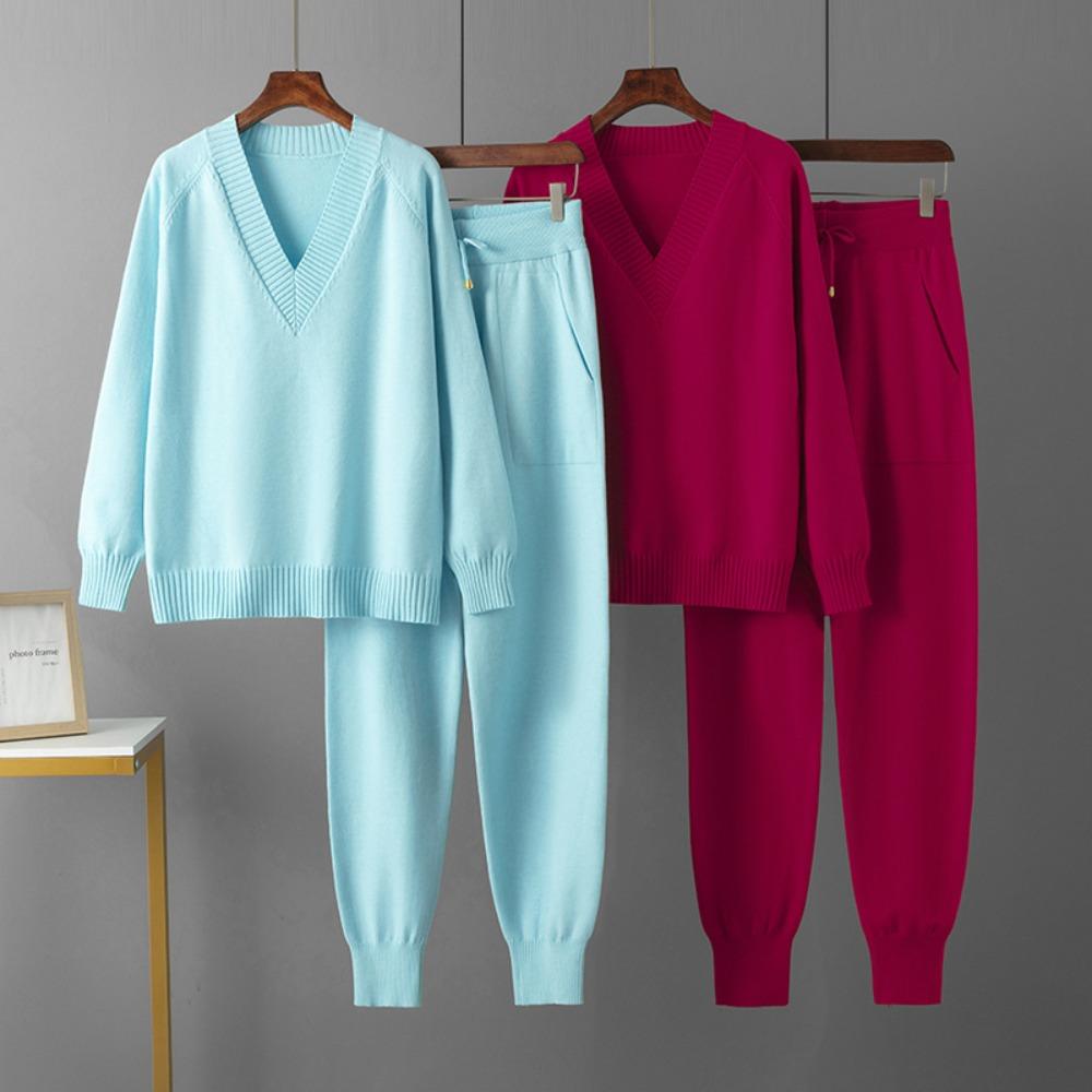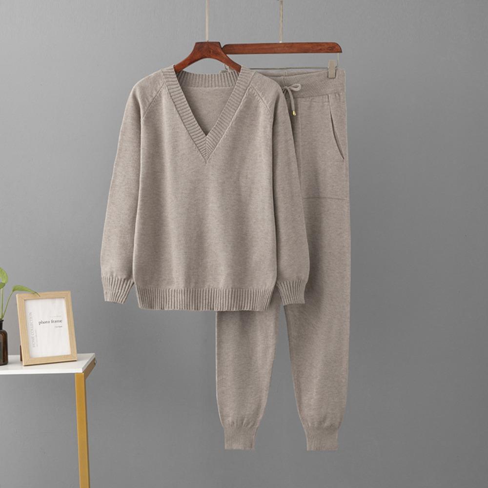 Женский осенне-зимний свитер с V-образным вырезом, комплект из двух предметов, вязаные брючные костюмы, модные повседневные пуловеры, спортивные костюмы, верхняя одежда