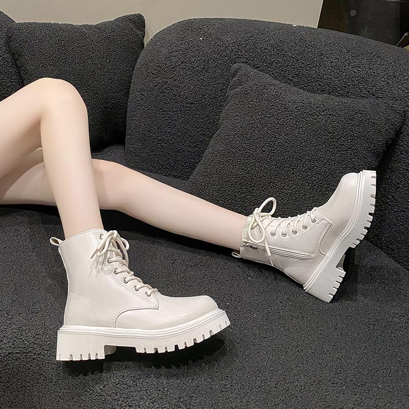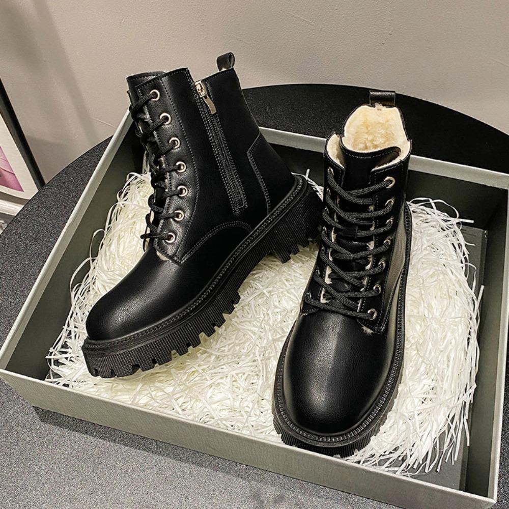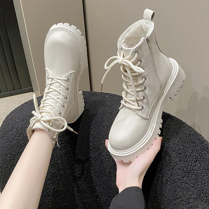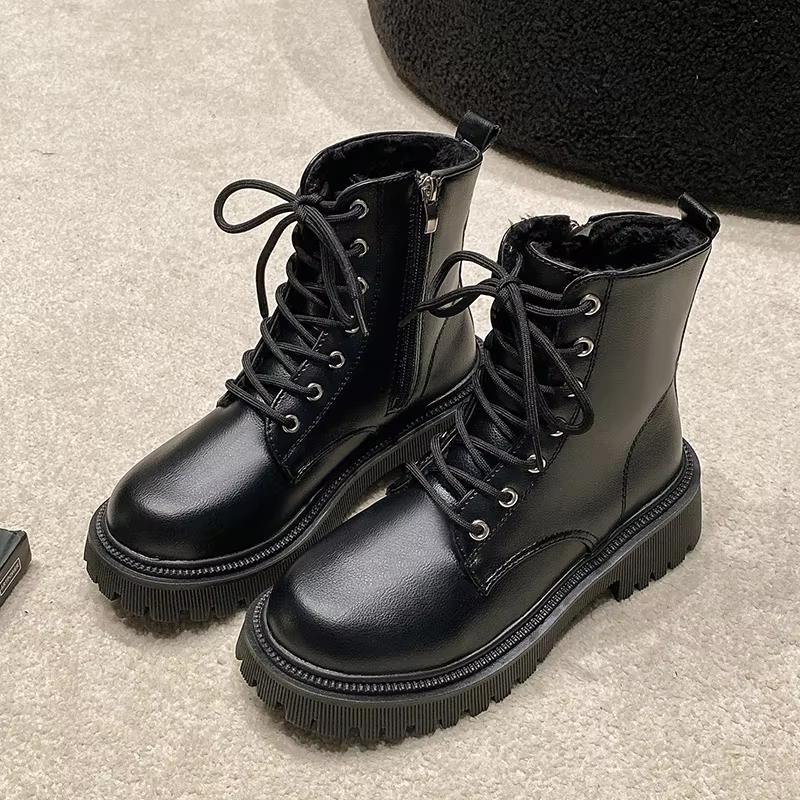 Женские ботинки 2025 Осень/Зима Новые Британский стиль Плюшевые Модные Толстая подошва Мотоциклетные ботинки Шнуровка Комфорт Молния Зимние ботинки