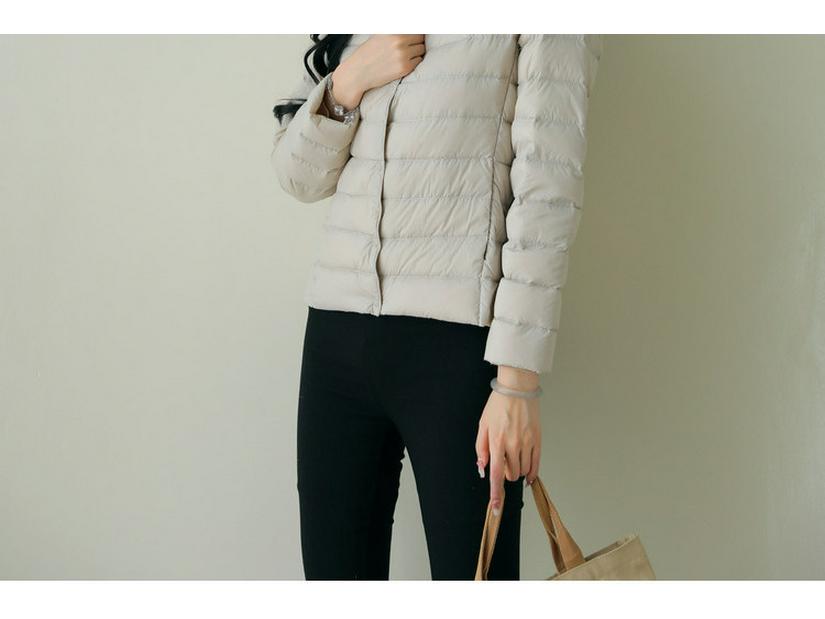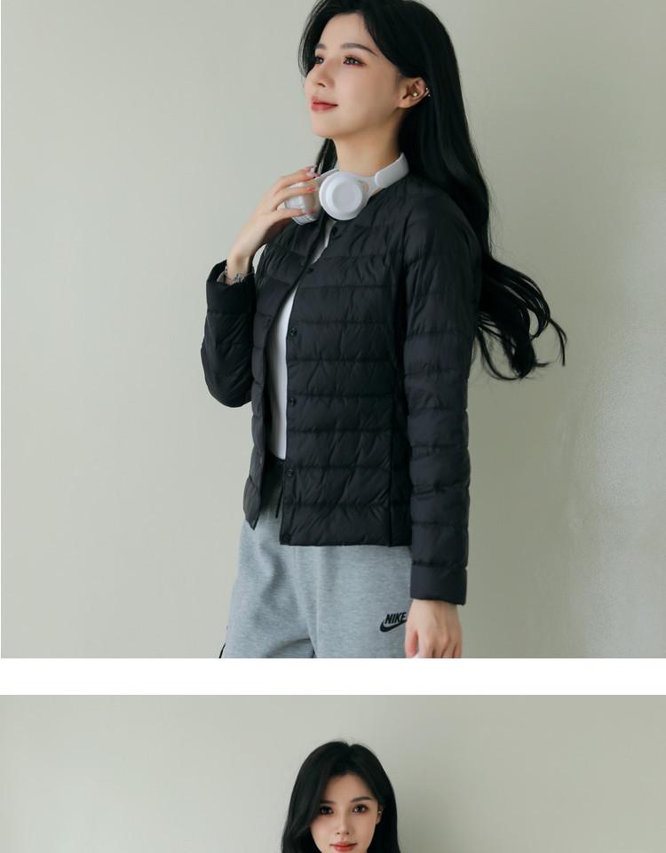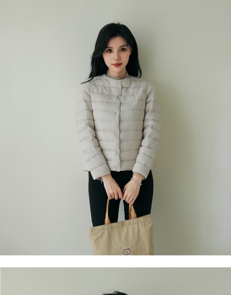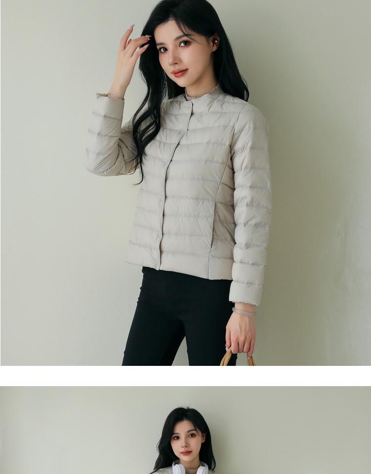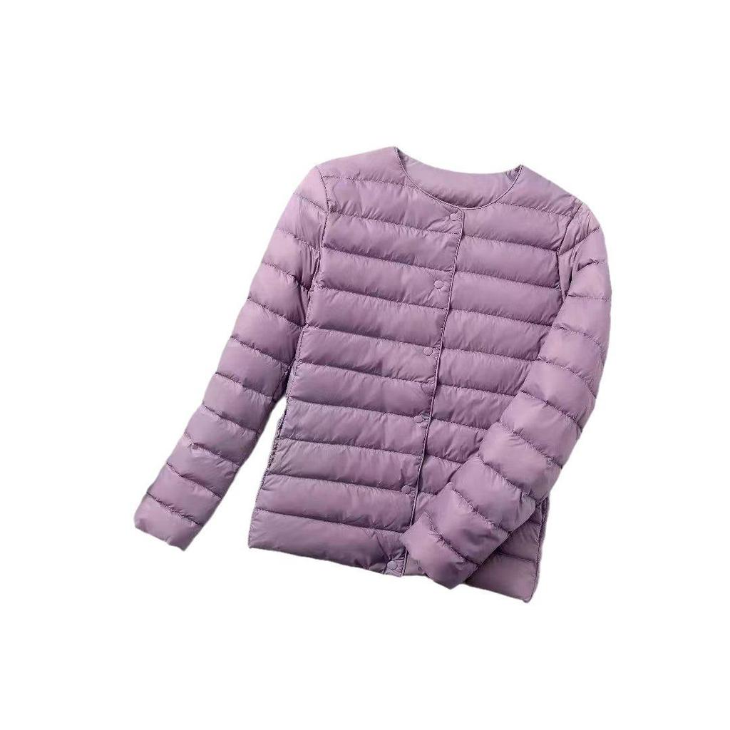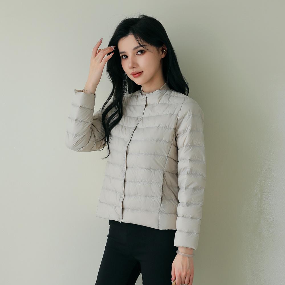 Эта женская легкая куртка на утином пуху станет идеальным дополнением к вашему осенне-зимнему гардеробу.. Изготовлено из гладкого нейлона, имеет тонкий слой роскошного утиного пуха, который обеспечивает тепло без лишнего объема.. Эта куртка, выполненная в современном стиле без воротника и с шикарным круглым вырезом горловины, обеспечивает облегающий силуэт, который подчеркивает фигуру.. Длинные рукава добавляют ему элегантности, делая его идеальным вариантом верхней одежды для прохладных сезонов.