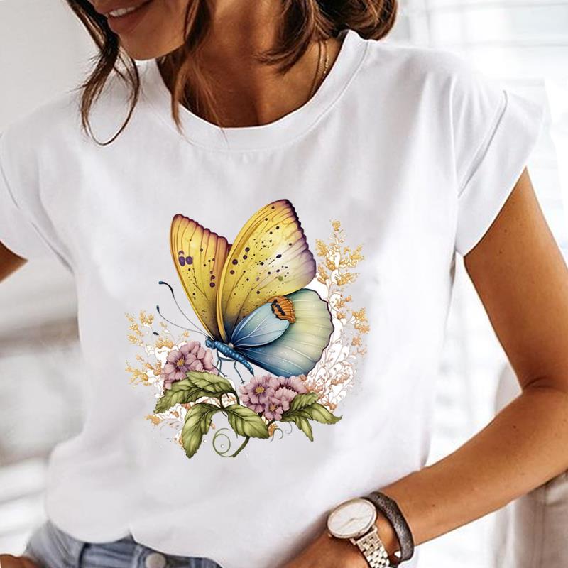 (Азиатский размер) Топ футболка милый стиль бабочки тренд футболка с коротким рукавом женская одежда повседневная мода принт леди женская графические футболки