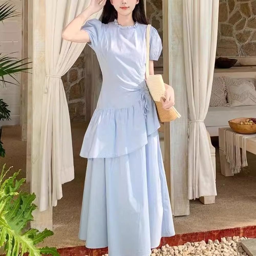 Синее платье с коротким рукавом женское летнее новое маленькое плиссированное и тонкое темпераментное платье-торт