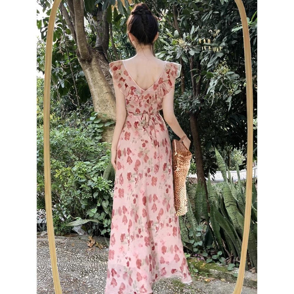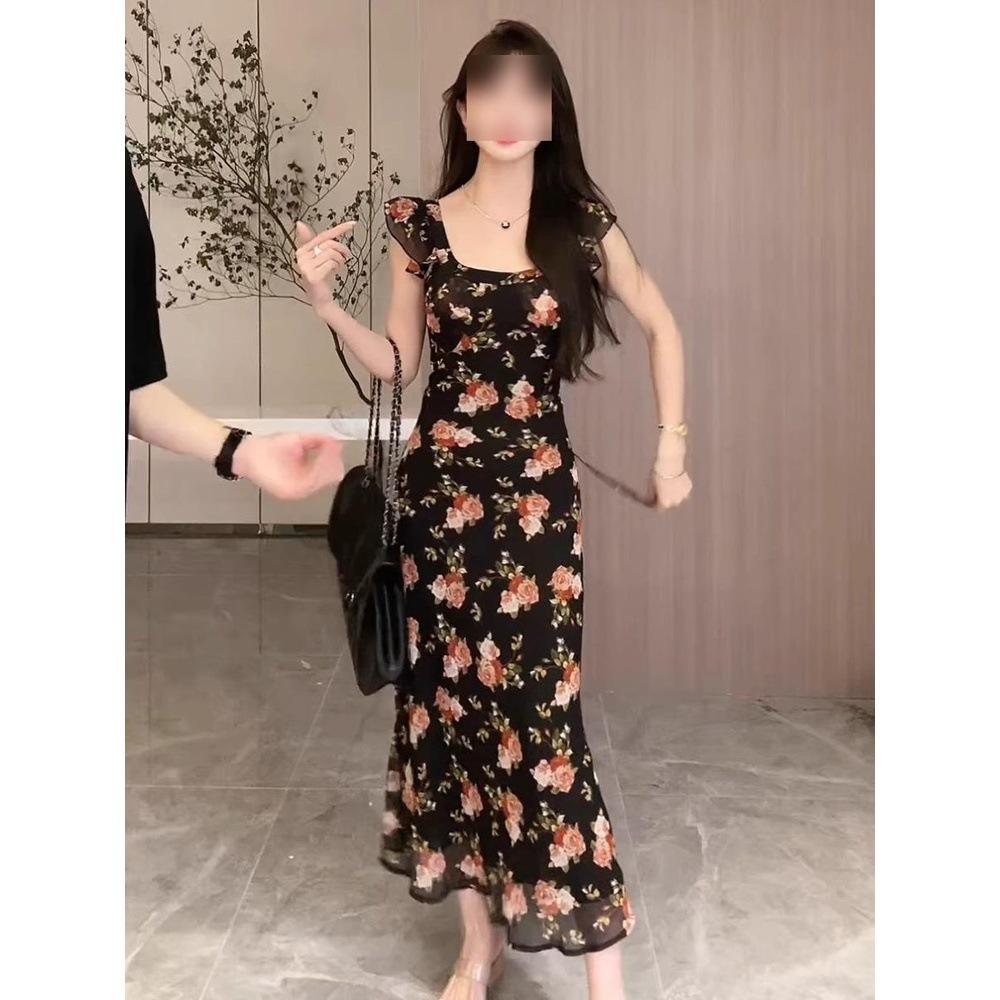 Ретро цветочное платье женское летнее новое в зарубежном стиле летящие рукава талия тонкое А-силуэтное платье