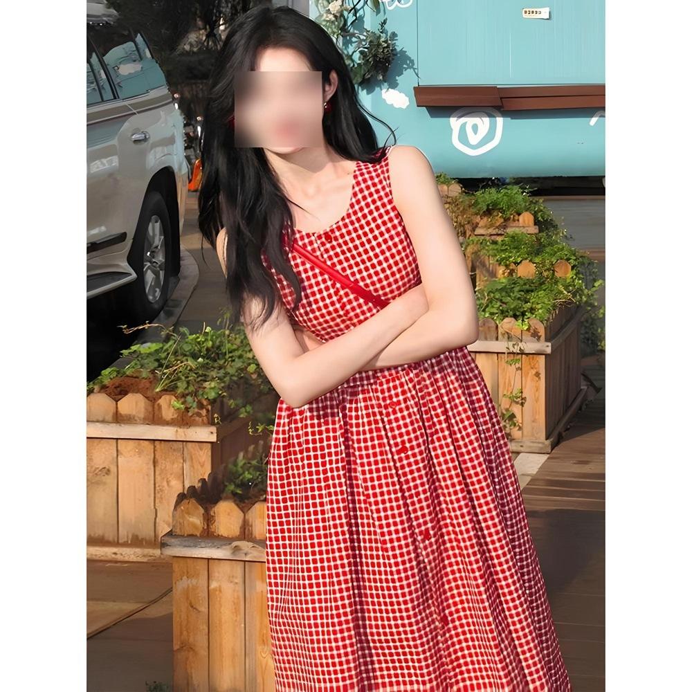 Красное клетчатое платье-жилет без рукавов новое свободное однобортное ленивый стиль длинное платье женское лето элегантность