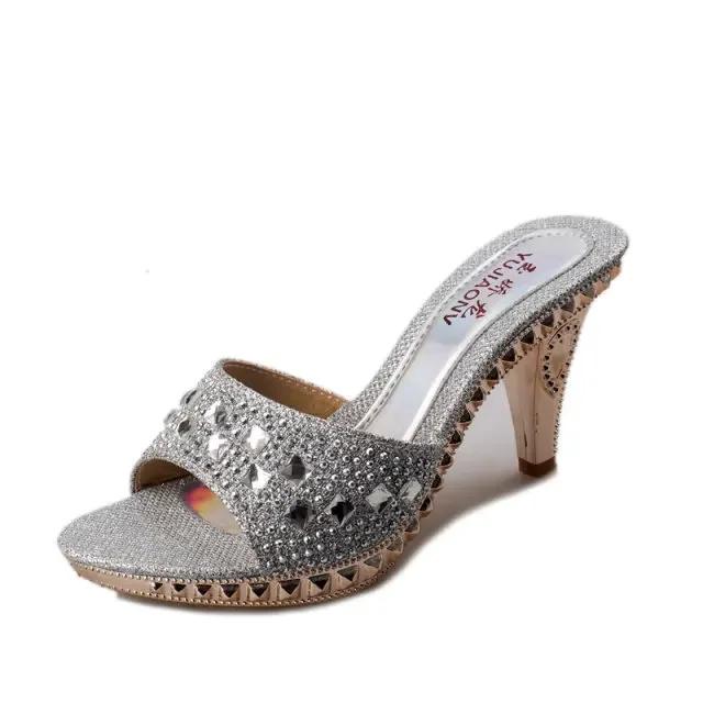 Элегантные босоножки на высоком каблуке со стразами, однотонные маленькие тапочки на толстом каблуке, летние сандалии, роскошные женские дизайнерские сандалии