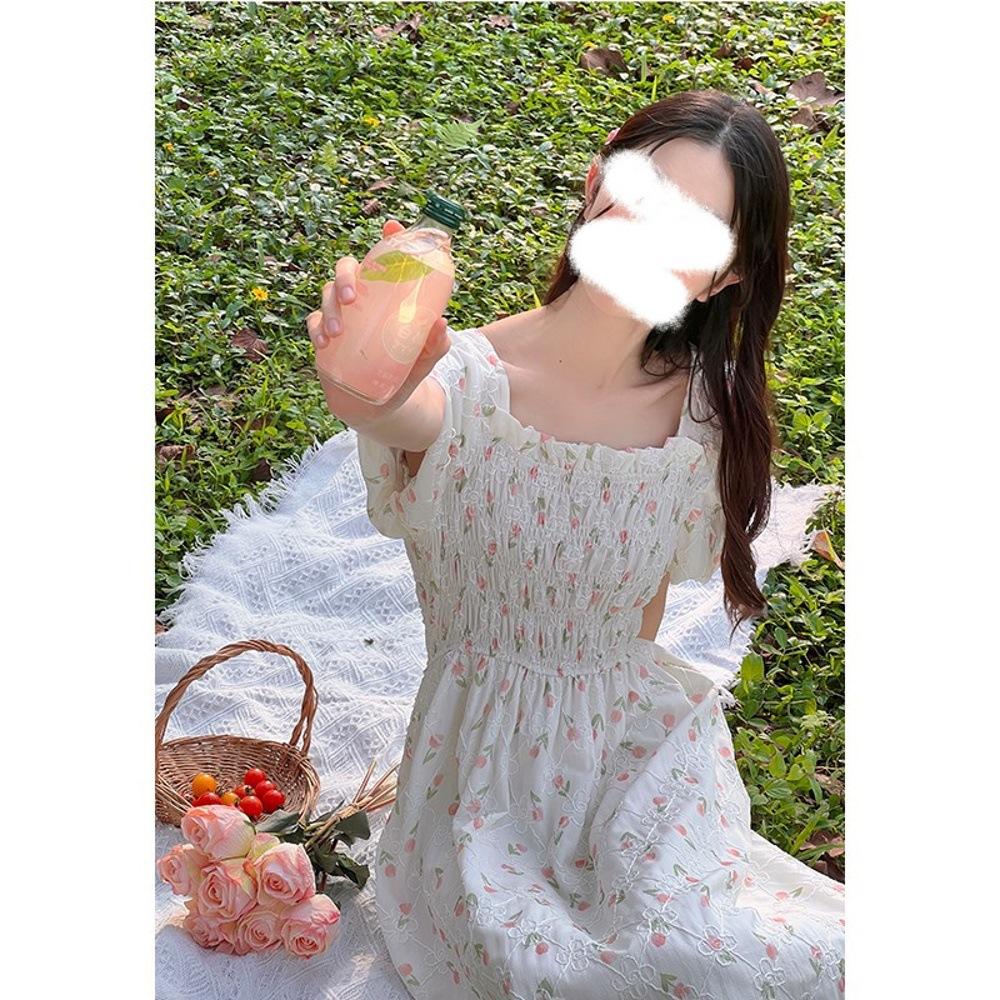 Платье с квадратным вырезом, цветочное, женское, летнее, новое, маленькое Мори, супер фея, маленькое свежее и стройнящее, средней длины