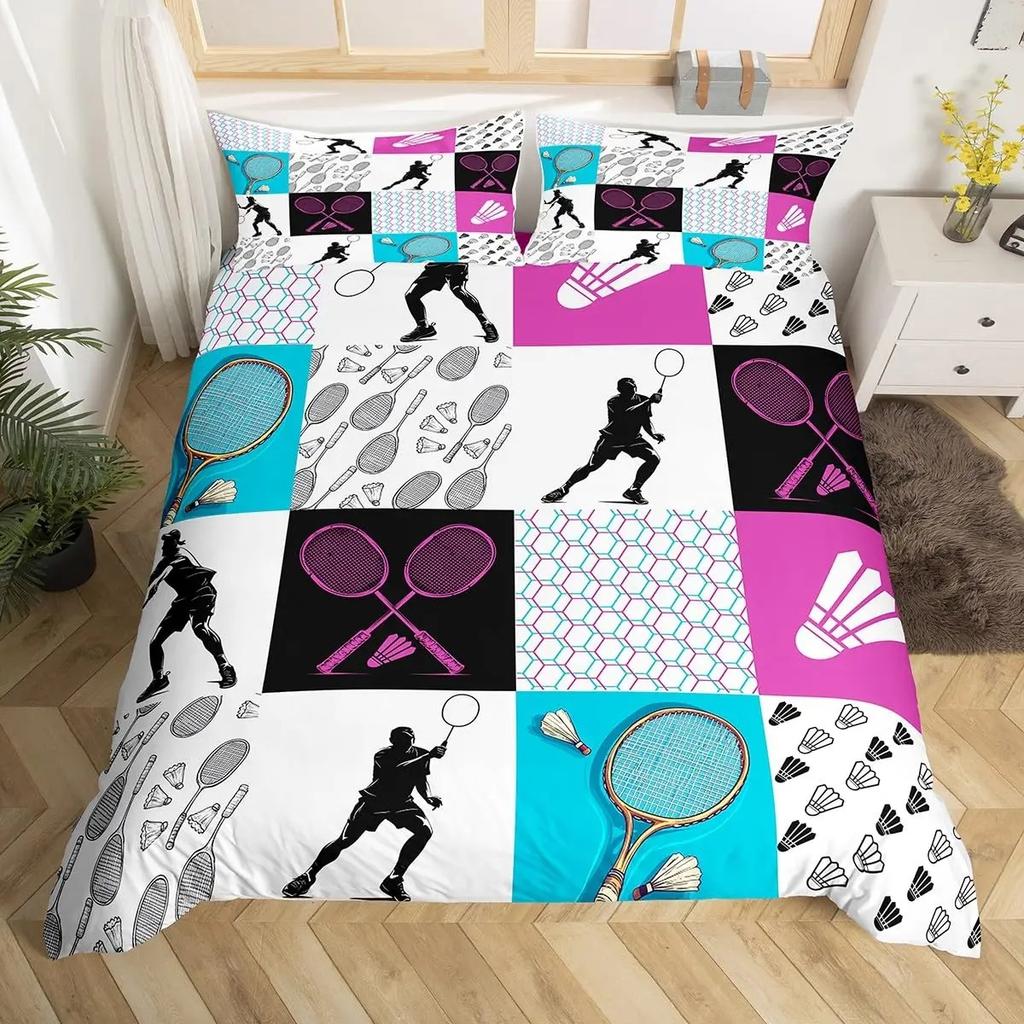 Комплект пододеяльника для бадминтона Комплект постельного белья для бадминтона Спортивный комплект постельного белья Декор комнаты для мальчиков и девочек Узор с мячами Черные комплекты пододеяльников