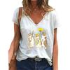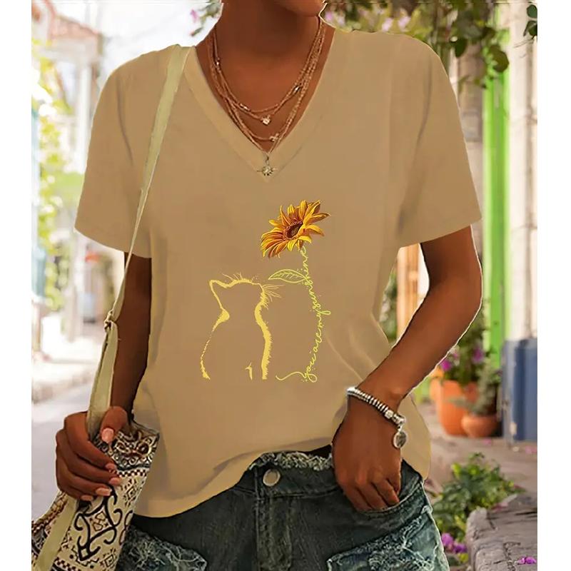 Модные блузки с рисунком кошки и подсолнуха, футболки с коротким рукавом и V-образным вырезом, повседневные
