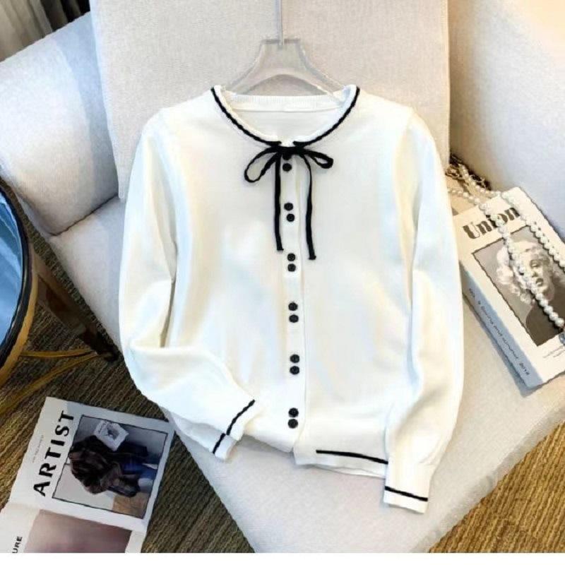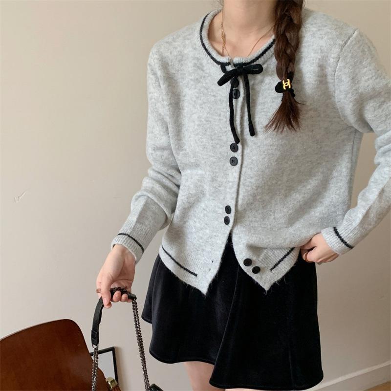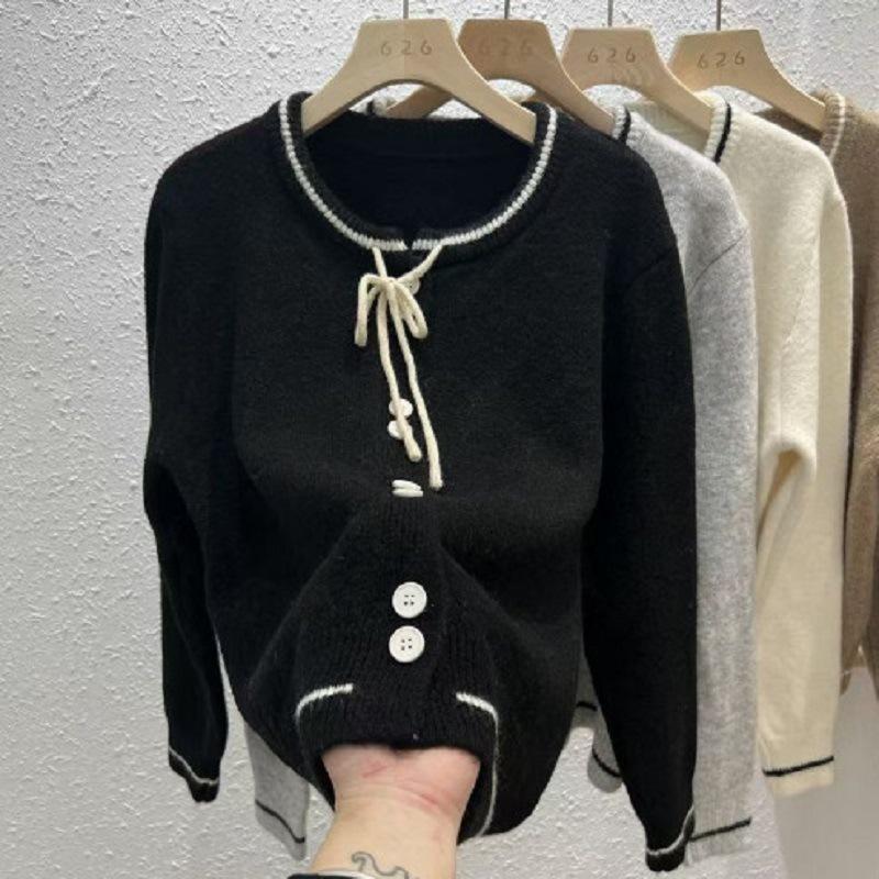 Французский милый кардиган на шнуровке с кружевом-бантом, в стиле маленького аромата, ранняя осень, маленький свитер-жакет, контрастный цвет, стиль колледжа