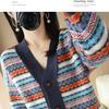 Осень и зима в зарубежном стиле полосатый ретро жаккардовый кардиган с длинным рукавом модный V-образный вырез контрастного цвета свободная куртка-свитер