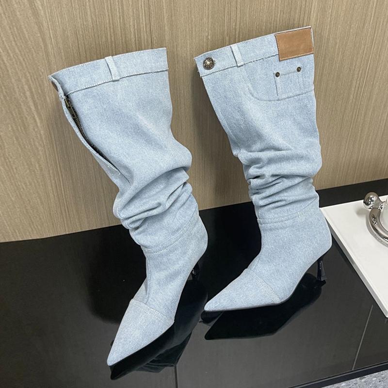 Новый стиль Плиссированные джинсы с отстрочкой Ботильоны до колена Женские Декор пуговицами и карманами Пэчворк Осень Зима Облегающие Туфли на тонком каблуке — купить товар онлайн с бесплатной доставкой по всему миру!