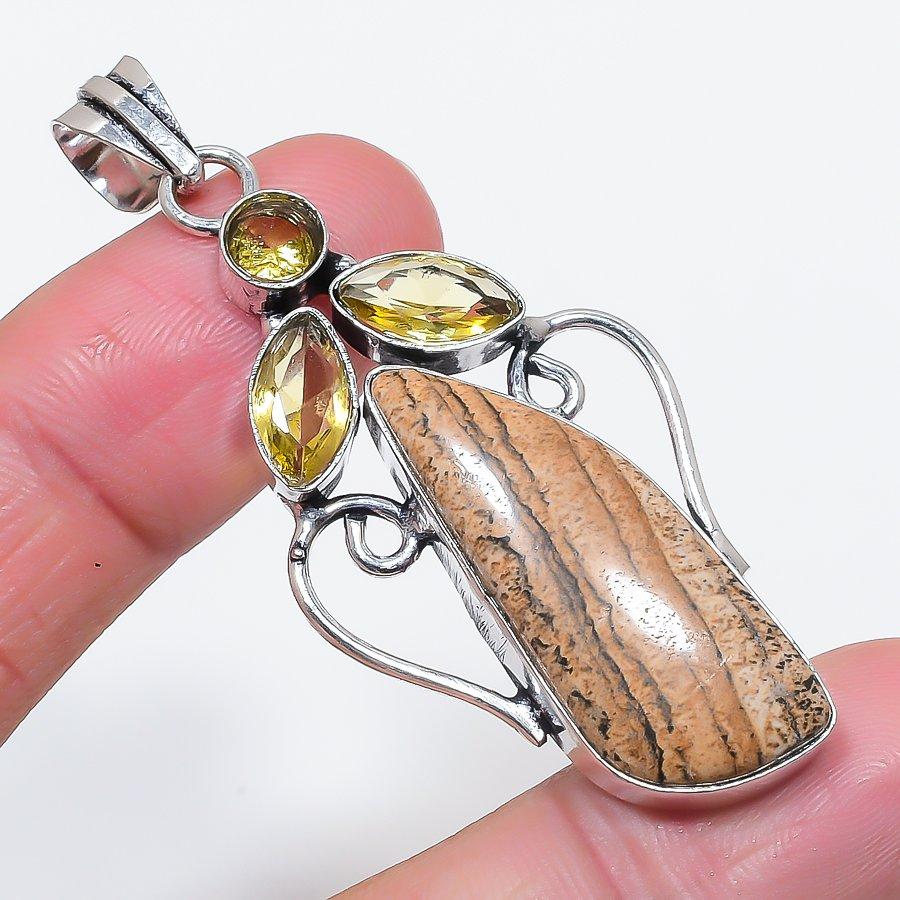Натуральный пейзажный яшма, цитрин, ювелирная подвеска из серебра 925 пробы, 2,56"