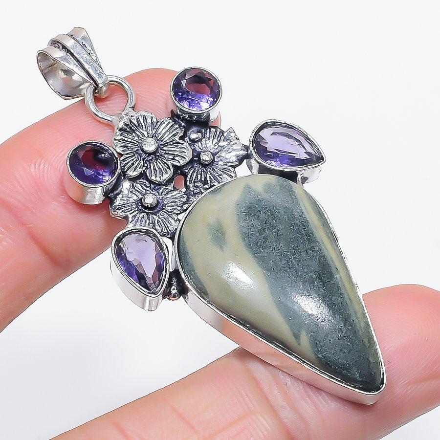Натуральная Императорская Яшма, Аметист 925 Стерлинговое Серебро Ювелирная Подвеска 2,36"