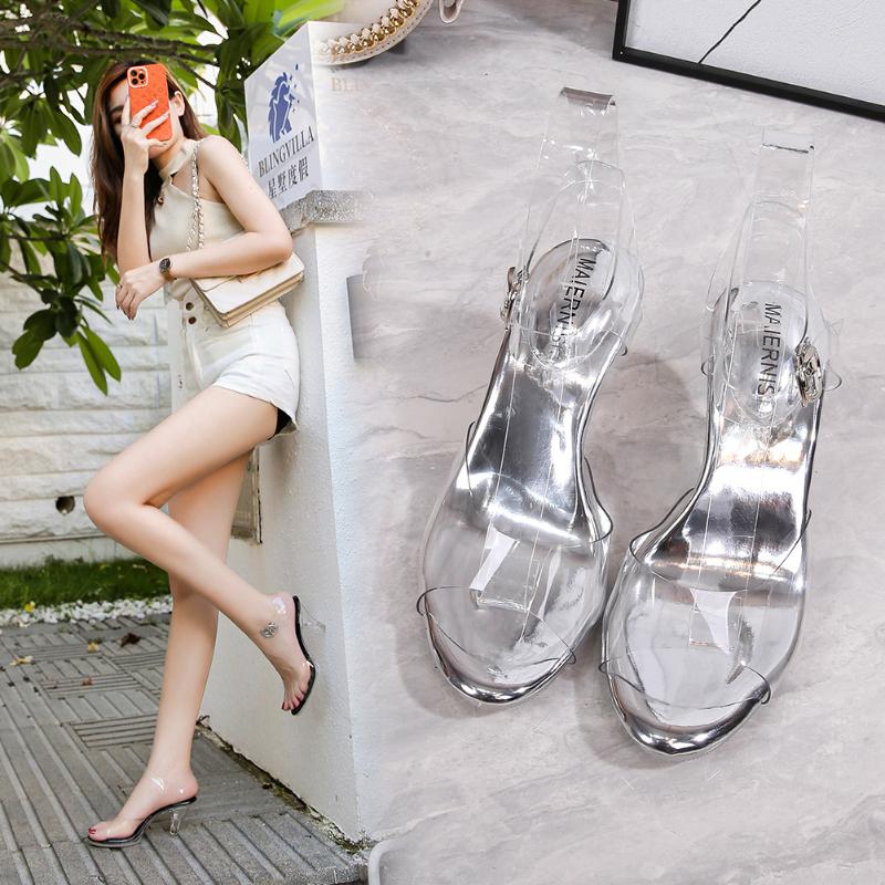 Новый стиль и модные сандалии интернет-знаменитости на хрустальном каблуке, прозрачные с перекрестными ремешками, на среднем каблуке, с открытым носком, большого размера, для повседневной носки