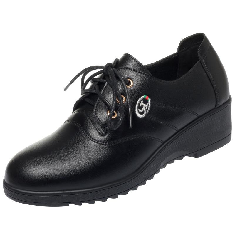 Весна Осень Удобные Нескользящие На шнуровке Женские Одинарные Туфли Туфли для Мамы Средний каблук Мягкая Танкетка Мягкая Кожаная Лодочка
