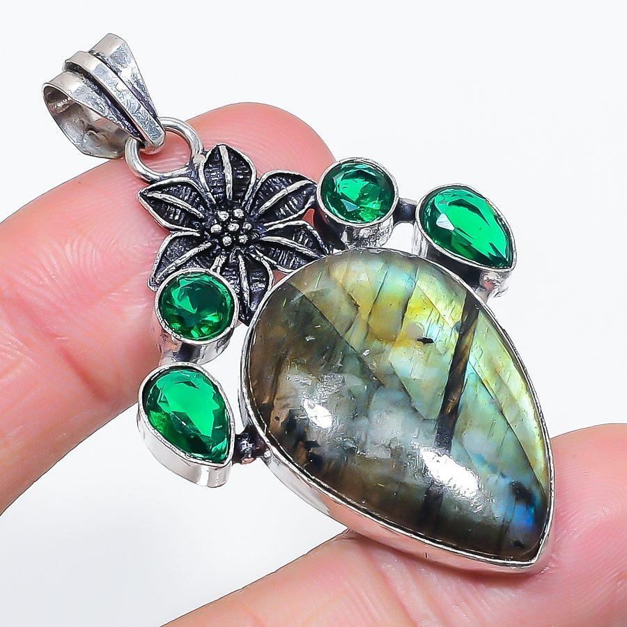 Natural Labradorite, Diopside 925 Sterling Silver Jewelry Pendant 2.29" o1e23