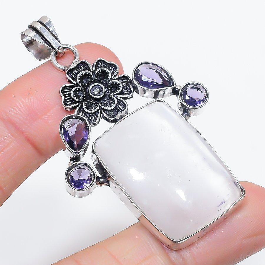 Натуральный селенит, аметист, серебро 925 пробы, ювелирная подвеска 2,44"