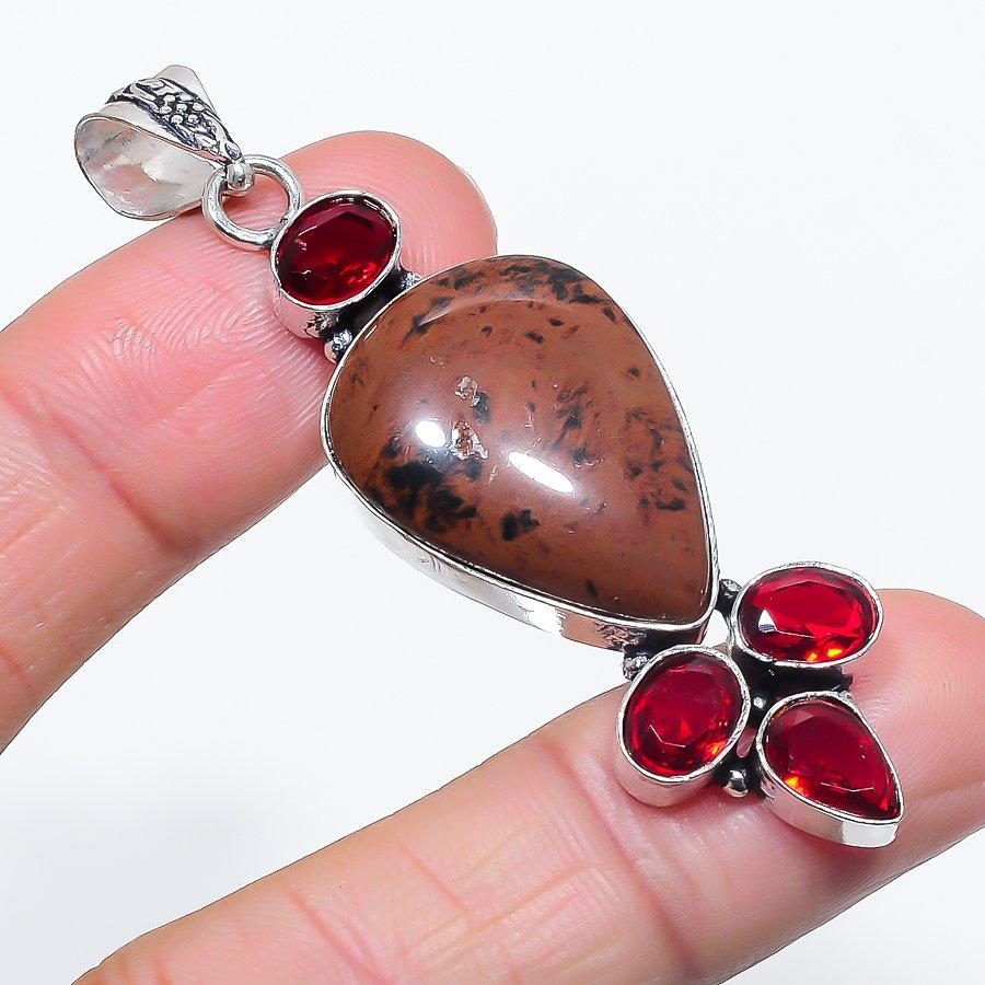 Натуральный махагоновый обсидиан, гранат, ювелирная подвеска из стерлингового серебра 925 пробы 2,60"