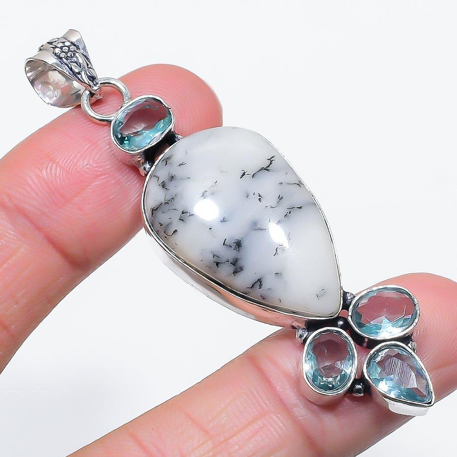 Natural Dendrite Opal, Topaz 925 Sterling Silver Jewelry Pendant 2.68" i2H91