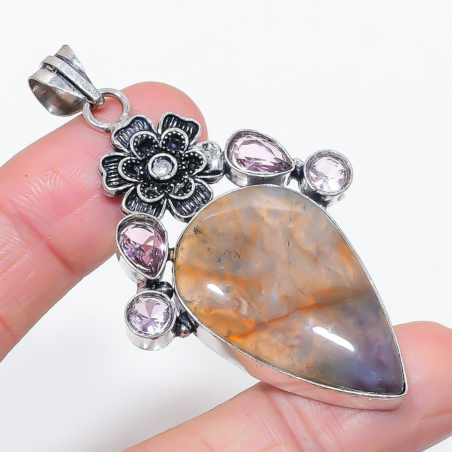 Natural Indian Moss Agate, Kunzite 925 Sterling Silver Pendant 2.68" T9C28