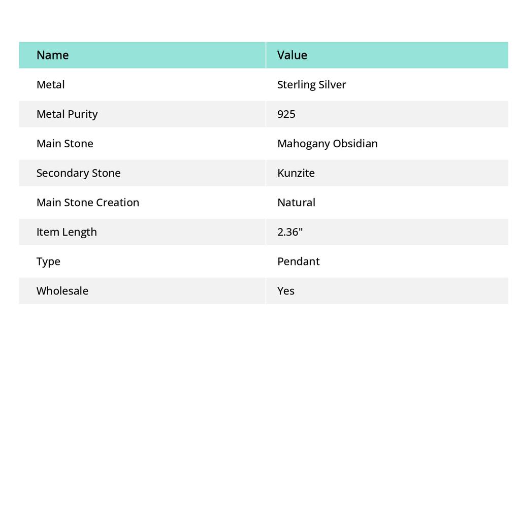 Натуральный махагоновый обсидиан, кунцит, кулон из стерлингового серебра 925 пробы 2,36"