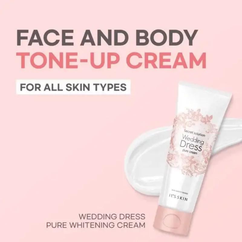 It's skin Secret Solution Wedding Dress Pure Cream — это осветляющий крем для лица и тела, который обеспечивает мгновенный эффект тонапа для естественно сияющего вида.. Обогащенный ниацинамидом и цветочными экстрактами, он выравнивает тон кожи, обеспечивая при этом увлажнение.. Идеально для ежедневного использования или особых случаев, чтобы улучшить цвет лица с мягким, сияющим финишем.