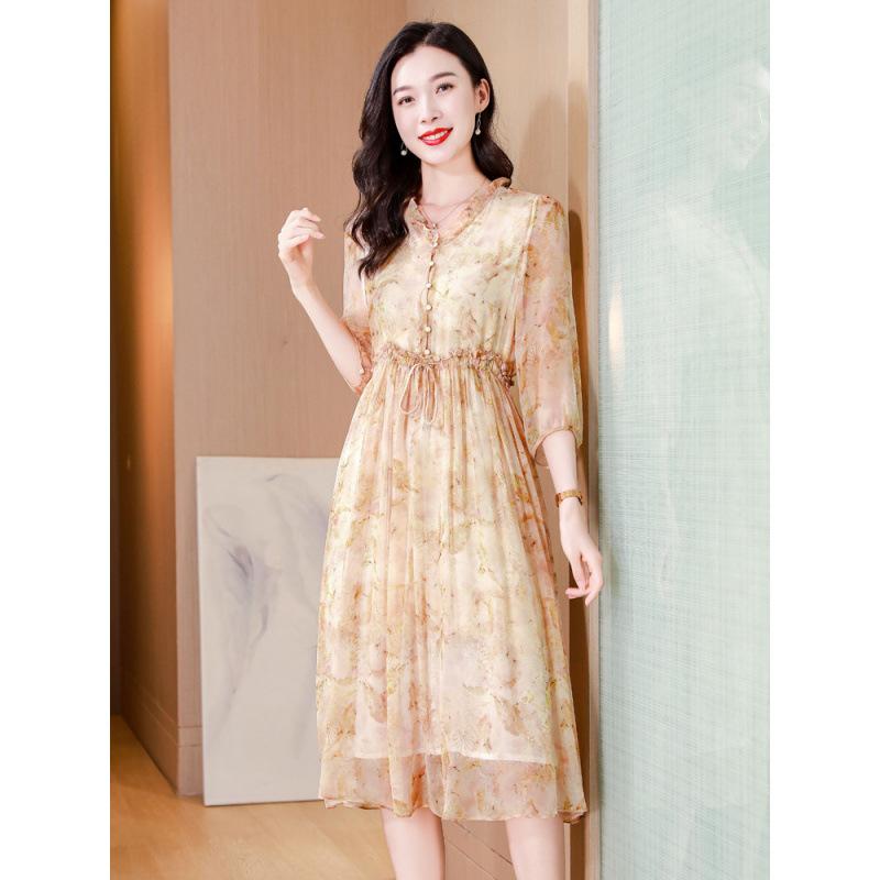 Summer silk dress V-neck temperament elegant intellectual mulberry silk dress printed lace-up skirt